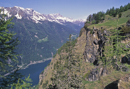 In realtà il "viaggio" comincia assai più in basso, quando, abbandonata la strada che sale al Passo del Bernina, si prende a destra imboccando la deviazione per Viano. Percorso un breve tratto fra prati e case, la strada si fa sempre più stretta e sembra letteralmente andare a cozzare contro la ripidissima pendice montuosa del versante sinistro orografico della Val Poschiavo. Pare impossibile che una carrozzabile possa superare questo altissimo muraglione naturale; invece, abilmente intagliata fra rupi e ripidissimi boschi di pini e abeti, la strada si contorce in mille tornanti, stretta, angusta e vertiginosa, eppure ben transitabile finché, come per magia, la dimensione verticale e oscura si interrompe per lasciare spazio ad un arioso poggio di prati sospesi. Poco dopo, lambito un piccolo cimitero eccoci a Viano 1281 m minuscolo pugno di case arroccate attorno ad una bianca chiesetta.
