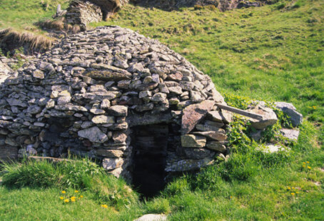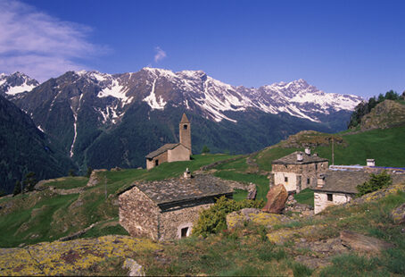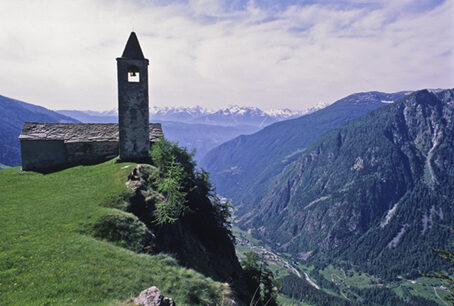Intanto, per la prima volta, forse, riusciamo a distogliere gli occhi dalla strada e a distrarci per un attimo: il panorama è meraviglioso, aperto sia verso l'alta Val Poschiavo ed i colossi glaciali del Bernina che verso Sud, su Tirano e le Alpi Orobie. Una strada strettissima, ben acciottolata, si insinua fra le case, guizza fra due spigoli, compie un tornante e si libera nuovamente fra i prati curatissimi, già sopra le case. Si devono seguire le indicazioni per San Romerio traversando lungamente, fra maggenghi e bosco, in direzione Nord-ovest. Al termine dell'asfalto si prosegue ancora diritti lungo una bella strada sterrata che raggiunge il maggengo di Predasc e prosegue oltre. Più avanti, in corrispondenza di un tornante, si incontra la partenza della mulattiera per San Romerio che si inoltra nel fitto bosco. Si consiglia di partire da qui, ma, qualora si avesse poco tempo a disposizione, è possibile proseguire lungo la strada e, evitando tutte le deviazioni a destra, raggiungere un ampio parcheggio. Da qui, chiusa da una sbarra, si dirama a sinistra una strada che in breve si ricollega alla mulattiera. Qualsiasi sia la soluzione adottata, poco dopo l'incrocio fra i due tracciati eccoci a lambire la splendida baita del Piaz: tanta tranquillità rotta solo dai turisti che, spesso in gran numero, vanno verso San Romerio. Siamo a 1678 metri di altitudine; la strada prosegue assai larga e, dopo una breve salitella, entra di nuovo nel bosco ora composto principalmente da larici ed abeti. Dopo un lungo tratto a mezza costa fra il verde delle conifere aggrappate alla ripidissima costa, ecco sbucare - per la prima volta - il verde gradino ove sorge lo xenodochio. Sembra a portata di mano, ma, per arrivarci, occorrono almeno altri quindici minuti di cammino. Due salite brevi, ma ripide, portano ad un nuovo tratto di strada pianeggiante che, infine, esce dal bosco per depositarci al limite dei prati di San Romerio. La spalla prativa ove sorge l'antica chiesa è occupata da alcuni rustici di cui uno adibito a ristoro e da un paio di "tegie", caratteristiche costruzioni in pietra a forma di igloo utilizzate dai pastori di Val Poschiavo e Val Grosina per la conservazione di latte e burro. Oggi, più prosaicamente, le due piccole strutture sono adibite a cantina. Purtroppo l'antistante fontana in cemento crea uno stridente e sgradevole contrasto con le due povere ma armoniose costruzioni e, in generale, con il paesaggio circostante.
