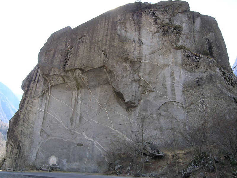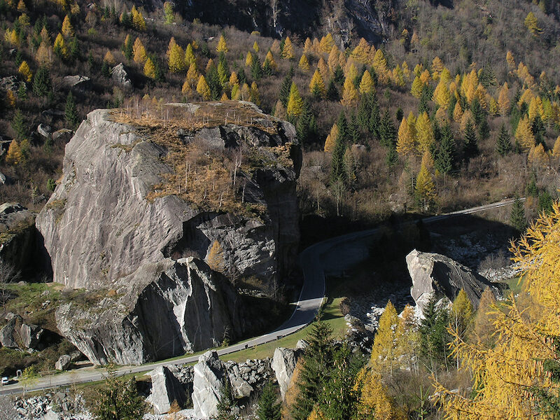 Poche centinaia di metri più avanti questo imponente paesaggio quasi scompare poiché la nostra attenzione è inevitabilmente attratta da quella che appare come una grande emergenza rocciosa e che, invece, è un enorme blocco monolitico: è il Sasso Remenno, uno dei simboli della Val Masino assieme al Pizzo Badile e al Gigiat, il mitico animale mezzo caprone e mezzo camoscio che, si dice, vive ancora in pochissimi esemplari nelle più remote vallate di questi monti.