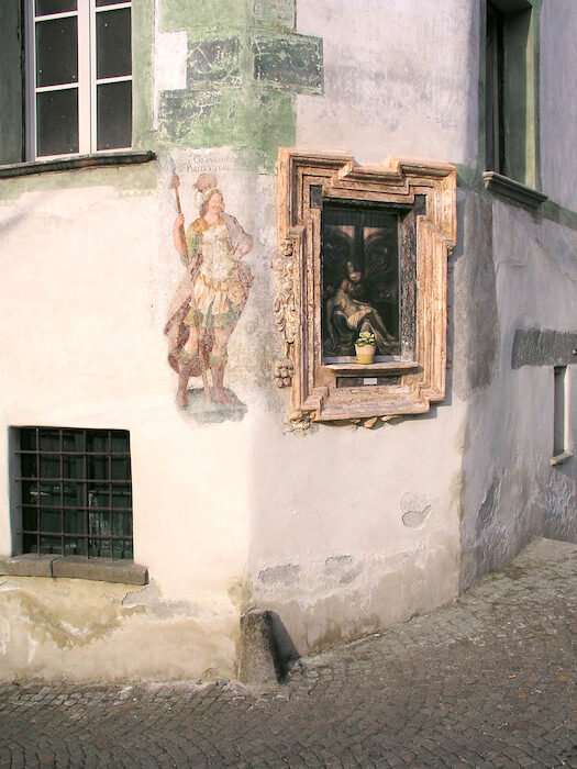 Da Piazza Garibaldi ci si porta al vicino ponte sul Mallero e, raggiunta la sponda opposta, si piega a destra lambendo l'antico palazzo Sertoli-Rajna oggi sede del BIM (Bacino Imbrifero Montano dell'Adda) e della Biblioteca Luigi Credaro. All'altezza del ponte metallico coperto, costruito dopo l'alluvione del 1987 su progetto dell'Arch. Giovanni Bettini, si piega a sinistra entrando nell'antico quartiere di Cantone. In quest'angolo, sul muro della casa di fronte al ponte, un tempo interamente decorata, s'indovinano ancora gli affreschi raffiguranti i Santi Gervasio e Protasio patroni della città. Fatti pochi metri nella suggestiva via Romegialli la si abbandona per salire a destra in via Baiacca, passando sotto una volta (sul muro della casa che precede il passaggio coperto si trova l'affresco dell' Incoronazione della Vergine di Pietro Ligari).