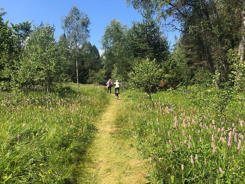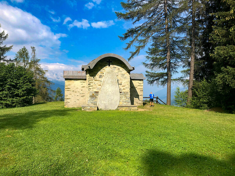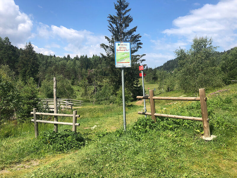 Dai parcheggi subito dopo l'Albergo delle Betulle, lasciare l'auto, traversare la carreggiata e imboccare il percorso per racchette da neve (cartellini rossi) che, varcato il recinto dell'oasi giunge in breve a un bivio. Si piega subito a sinistra traversando l'emissario della palude su un ponticello poi si prosegue in piano (in alternativa al bivio si può andare dritti ed imboccare una passerella di legno che passando sulla torbiera piega poi ad arco verso sinistra ritrovando l'altro percorso). Senza salire nel bosco si piega a destra seguendo il tracciato che costeggia la palude. Si traversa un breve camminamento di legno posto sul terreno paludoso e si risale un dosso fra prati e macchie di bosco. Poco più avanti ci si immette in una sterrata che si segue verso sinistra e si arriva a un gruppo di baite (1413 m) poste quasi sul crinale dal quale ci si affaccia sul Passo di Aprica. Ora la stradina scende lambendo altri prati e poi rientra nel bosco fino ad ampio piano prativo situato al margine occidentale della torbiera. A destra si trova il laghetto della palude che inquadra sullo sfondo il massiccio dell'Adamello. Proseguendo sulla strada, ora asfaltata, si va verso destra lambendo il poggio su cui sorge la chiesetta di San Fortunato la cui parete orientale ingloba un curioso monolite in forma di menhir. Vi sono molti dubbi sull'antichità del manufatto che fu ricavato da un blocco di roccia granitica ben diversa dai morbidi scisti di Edolo che formano queste creste. Continuando sulla strada, dopo poche centinaia di metri si giunge a un trivio e a un piazzale parcheggio dove dei cartelli indicano il proseguimento verso destra (In alternativa, poco prima della chiesa è anche possibile percorrere stradina a destra che costeggia palude e si immette sulla strada comunale circa 250 m dopo parcheggio sopra menzionato). Proseguire sulla strada, ora sterrata, per altri 100 m giungendo ai cartelli che indicano a sinistra la deviazione verso le fortificazioni del Monte della Croce 1489 m. Imboccare il sentiero e salire nel bosco fino a immettersi su una sterrata che giunge dalla vicina strada Trivigno (ristorante La Quercia Antica). Piegare a sinistra e procedere in dolce salita incontrando un primo cartello esplicativo inerente la geologia dei luoghi. Al primo tornante c'è la possibilità di fare una breve deviazione scendendo a sinistra lungo un ripido sentiero che porta a belvedere (gradini legno). Tornati sulla strada si sale incontrando un secondo cartello che illustra alcune opere militari nei pressi (due gallerie e piazzola). Poco più avanti lasciare a destra un'altra deviazione che porta ad altre postazioni e salire verso sinistra arrivando sulla cima del Monte della Croce dove si trovano i resti delle postazioni difensive principali. Tornati al punto in cui ci siamo immessi sulla stradina proseguire per essa arrivando sulla strada Piangembro-Trivigno che verso destra scende a immettersi sulla strada comunale che poi si segue per giungere al margine orientale dell'oasi e all'auto.